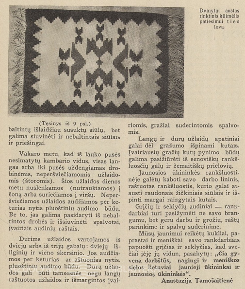 Tautinio stiliaus audiniai interjerui (straipsnio pradžia). Jaunasis ūkininkas.-1937, nr. 1, p. 9.