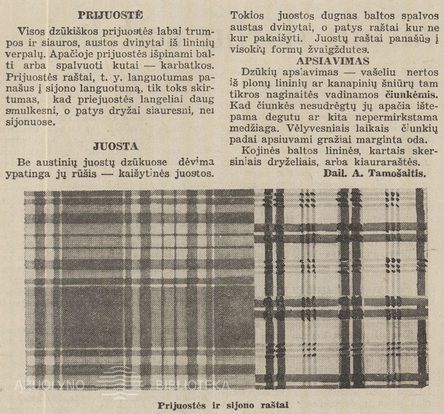 A. Tamošaičio straipsnis apie dzūkių tautinį kostiumą (straipsnio pradžia). Jaunasis ūkininkas.-1938, nr. 8, p. 116.