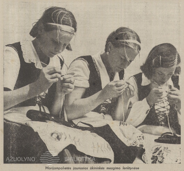 Mergaitės mokosi megzti. Ant stalo – A. Tamošaičio knygos „Sodžiaus menas“. Jaunasis ūkininkas.-1938, nr. 5, p. 80.
