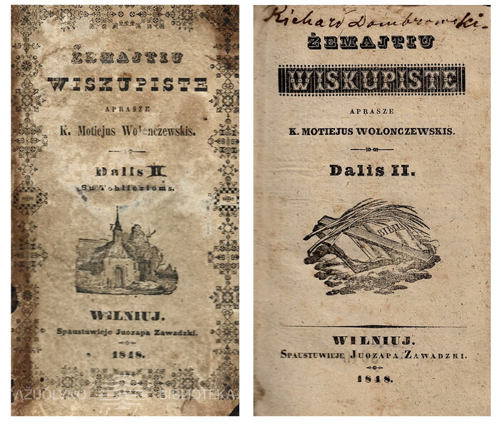 Žemajtiu wiskupistę / aprašė K. Motiejus Wolonczewskis [Kazimieras Motiejus Valančius]. – Vilnius : Juozapo Zavadzkio spaustuvė, 1848, d. 1. – KAVB RS R 13001-3 : įrašas „Autor JW Hrabi Leduchowskiemu w dowod wdzięcznosci … 1862“ (įrašas skirtas lenkų kardinolui Mečislovui Leduchovskiui).