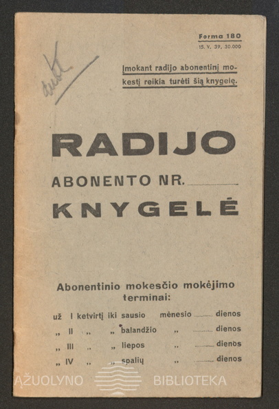 Radijo abonento knygelės pirmas puslapis. „Radijo abonento knygelė Nr.“ – Kaunas : Pašto valdyba, 1939.