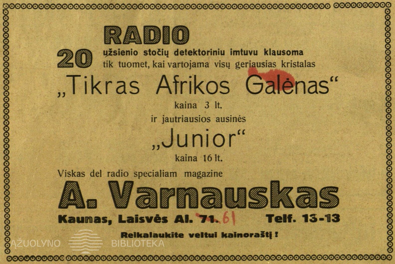 „A. Varnauskas [...] siūlo gerb. radio mėgėjams“. Radio bangos.-1933, nr. 32, p. nenumeruotas.