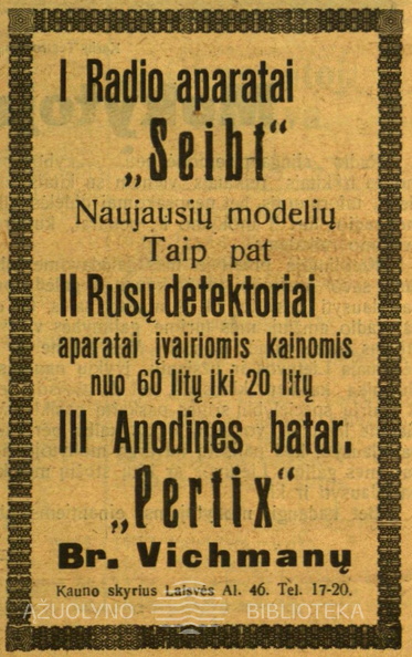 „Pirkimas radio aparatų ir dalių paremtas pasitikėjimu“. Paštininkų žodis.-1927, nr. 6, p. 23.