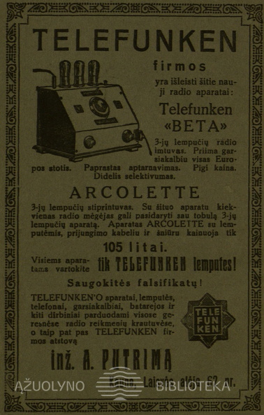 „Telefunken geriausi pasaulio radio aparatai“. 7 meno dienos.-1931, nr. 63, p. nenumeruotas.