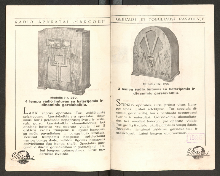 Radio aparatų „Marconi“ 1934 metams katalogas. – Kaunas: generalinis atstovas Lietuvai J. Sakalauskas, [1934].