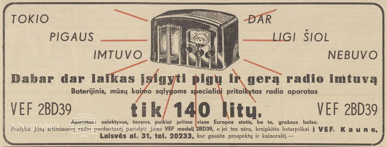 „Neregėtas pigumas. Reikalaukite visur tik VEF radijo aparatų“